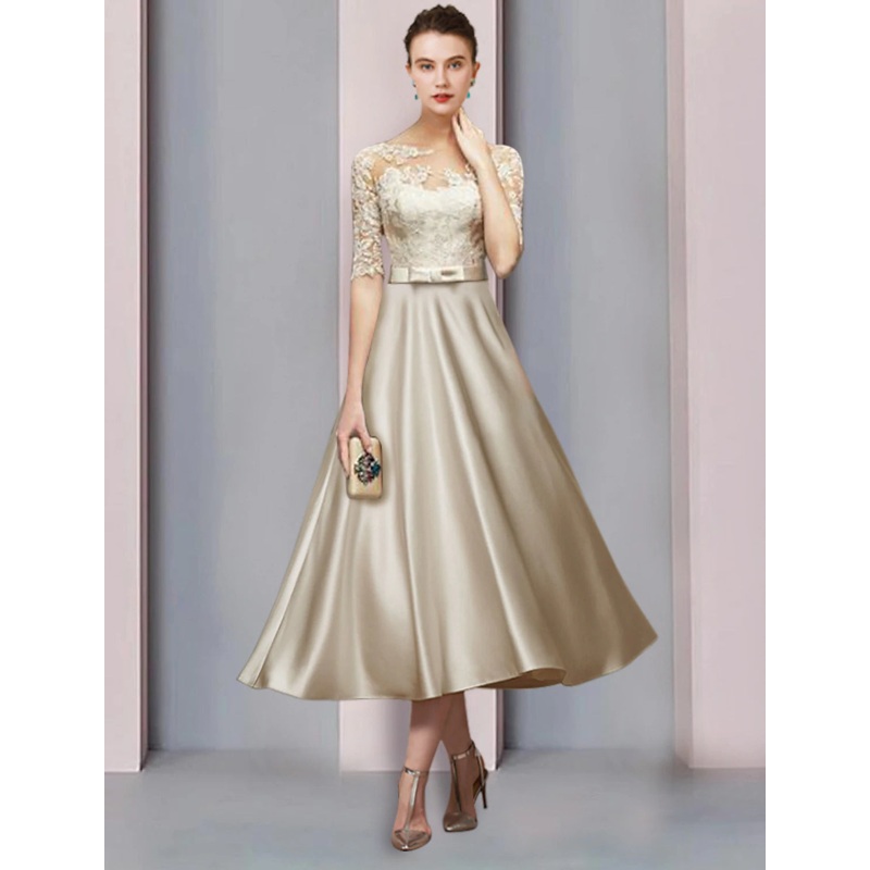 Sheath / Column Mother of the Bride Dress Wedding Guest Party Elegant Scoop Neck Tea Length Satin Lace Half Sleeve with Bow(s) Pleats