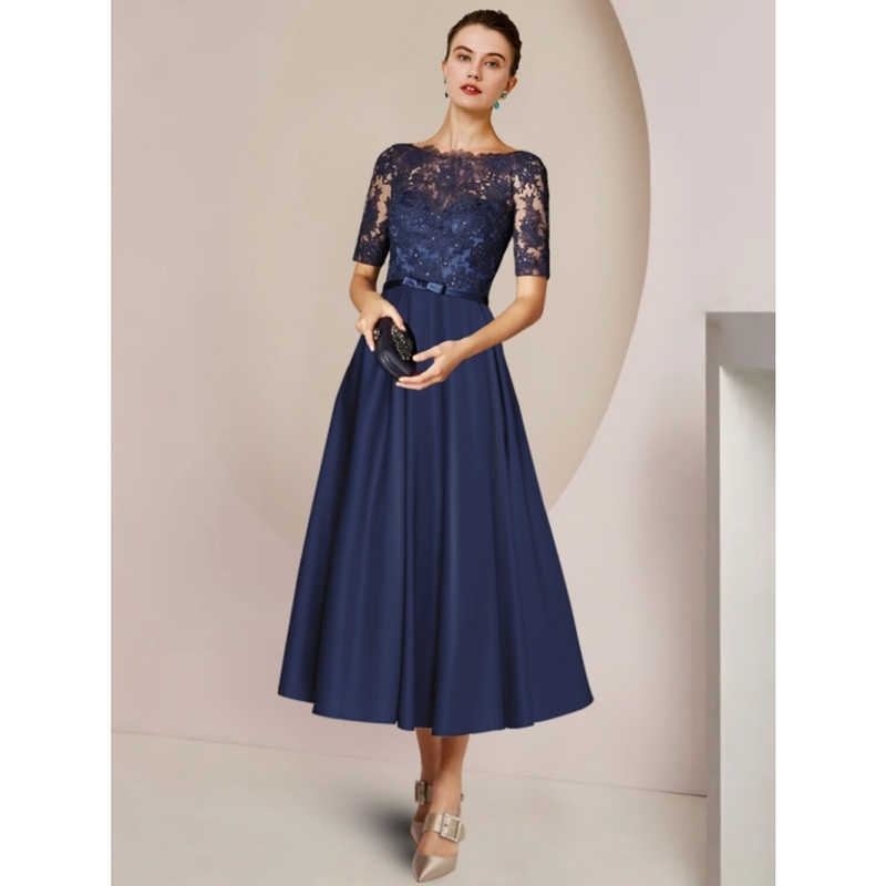 Sheath / Column Mother of the Bride Dress Wedding Guest Party Elegant Scoop Neck Tea Length Satin Lace Short Sleeve with Bow(s) Pleats Appliques