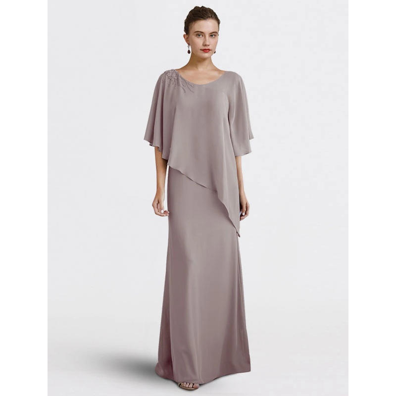 Sheath / Column Mother of the Bride Dress Wedding Guest Plus Size Elegant V Neck Floor Length Chiffon Half Sleeve with Beading Fall