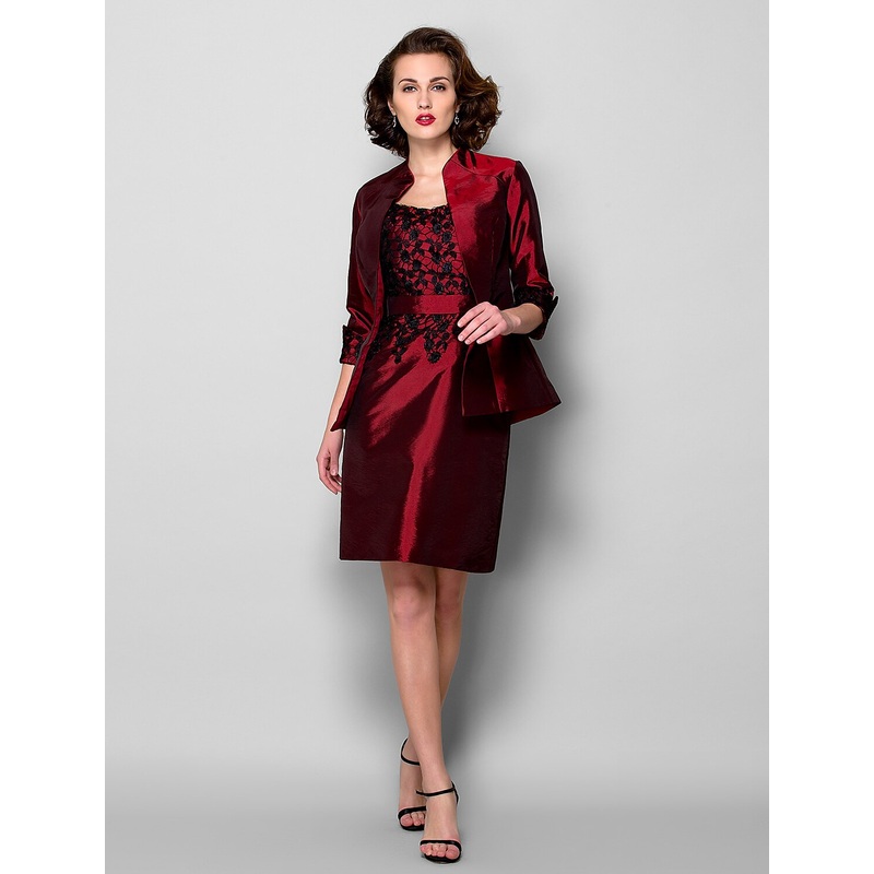 Sheath / Column Mother of the Bride Dress Wrap Included Scoop Neck Knee Length Taffeta 3/4 Length Sleeve with Lace Sash / Ribbon