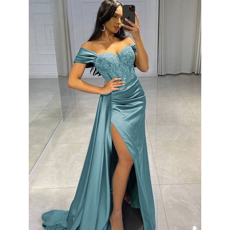 Sheath/Column NS Woven Satin Applique Off-the-Shoulder Sleeveless Sweep/Brush Train Dresses