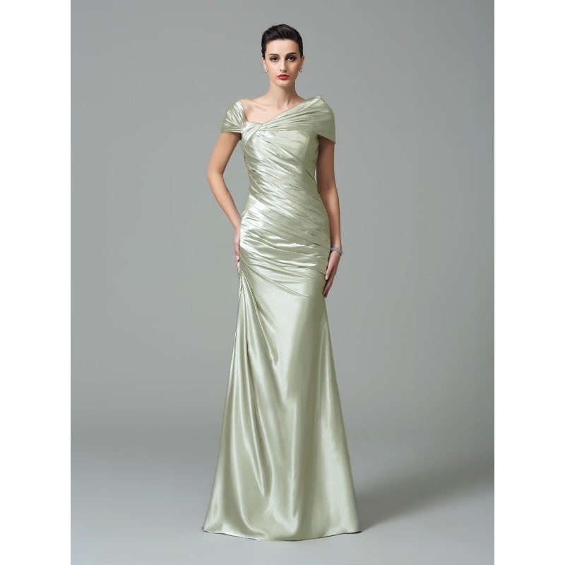 Sheath/Column Off-the-Shoulder Pleats Sleeveless Long Silk like Satin Dresses