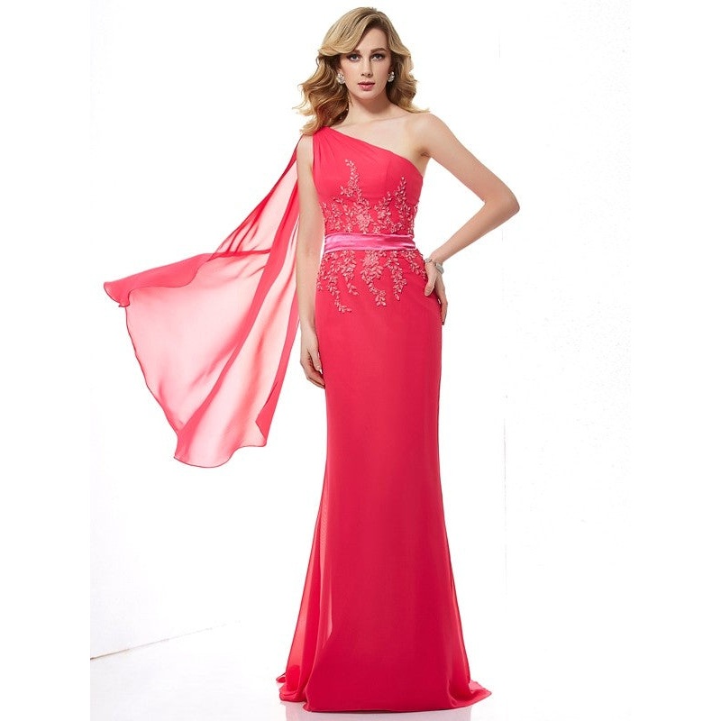 Sheath/Column One-Shoulder Applique Sleeveless Beading Long Chiffon Dresses