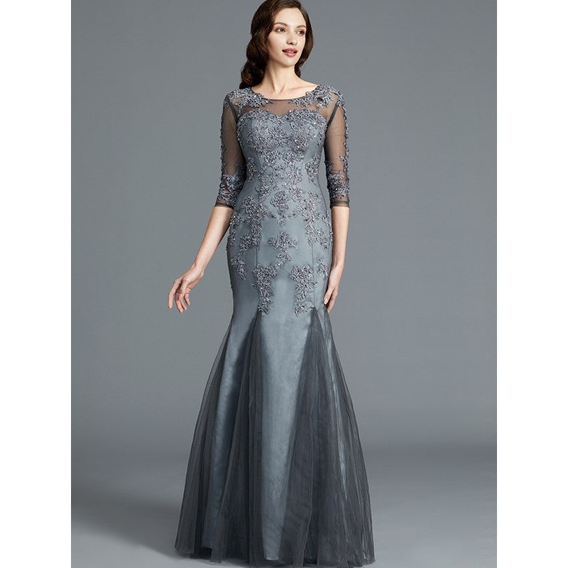 Sheath/Column Scoop Applique 1/2 Sleeves Tulle Floor-Length Mother of the Bride Dresses