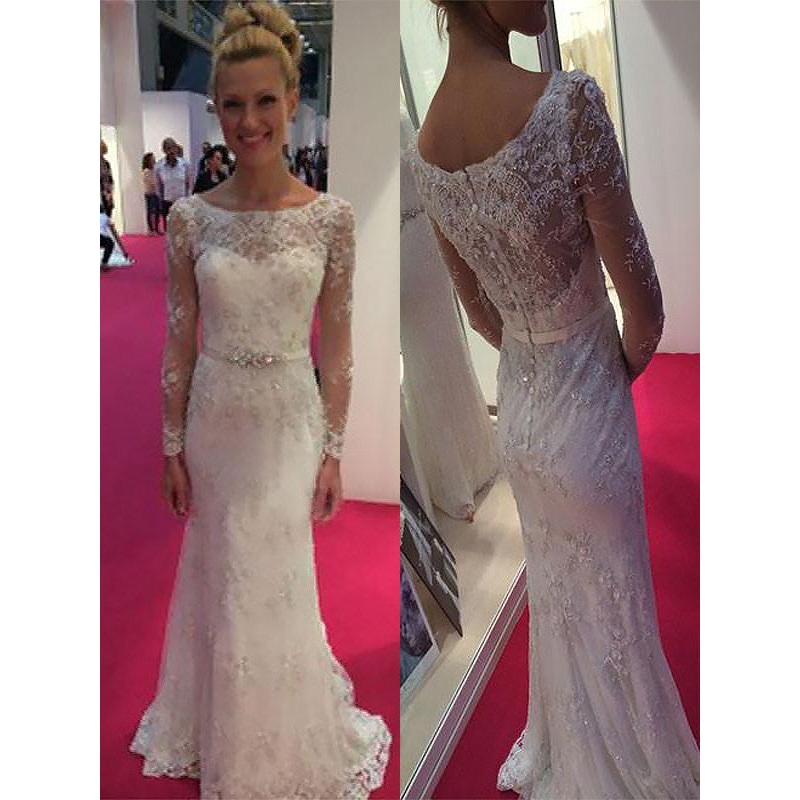 Sheath/Column Scoop Long Sleeves Lace Chiffon Sweep/Brush Train Wedding Dresses