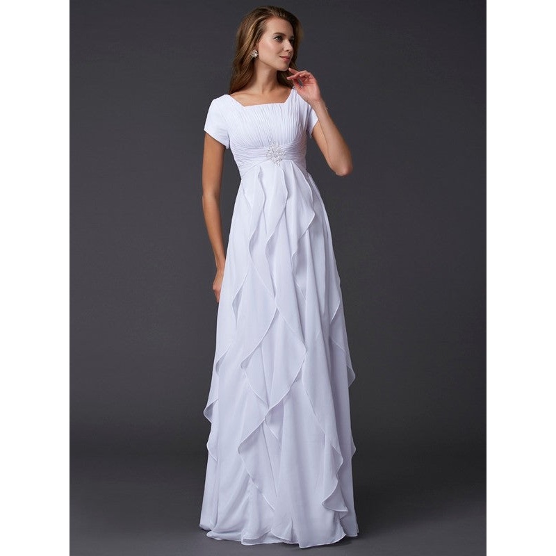 Sheath/Column Square Short Sleeves Ruffles Long Chiffon Dresses