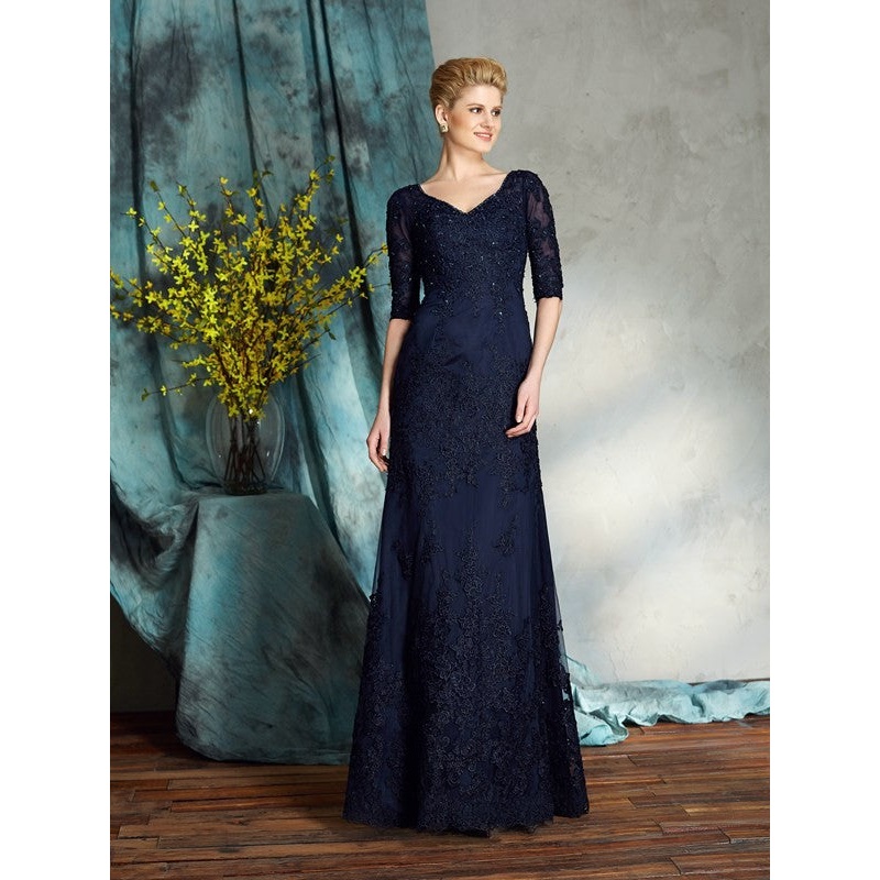 Sheath/Column V-neck Applique 1/2 Sleeves Long Satin Mother of the Bride Dresses