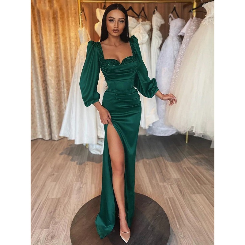 Sheath/Column Woven Satin Ruched Square Long Sleeves Floor-Length Dresses