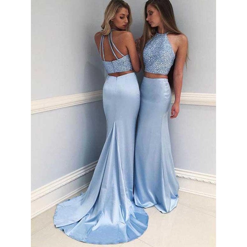 Sheath Halter Sleeveless Sweep/Brush Train With Beading Woven Satin Two Piece Dresses