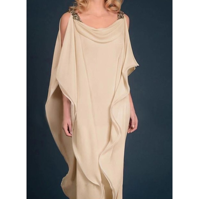 Sheath Mother of the Bride Dress Cape Dress Wedding Guest Elegant Plus Size Jewel Neck Floor Length Chiffon Half Sleeve with Beading Cascading Ruffles
