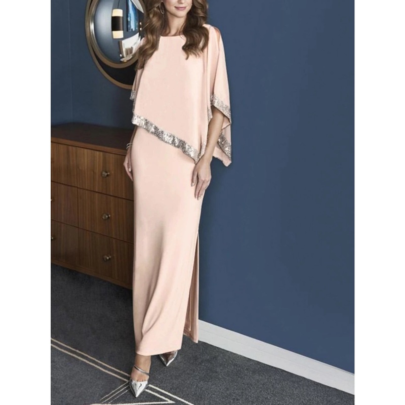 Sheath Mother of the Bride Dress Cape Dress Wedding Guest Elegant Sparkle & Shine Jewel Neck Ankle Length Chiffon 3/4 Length Sleeve with Sequin Split Front