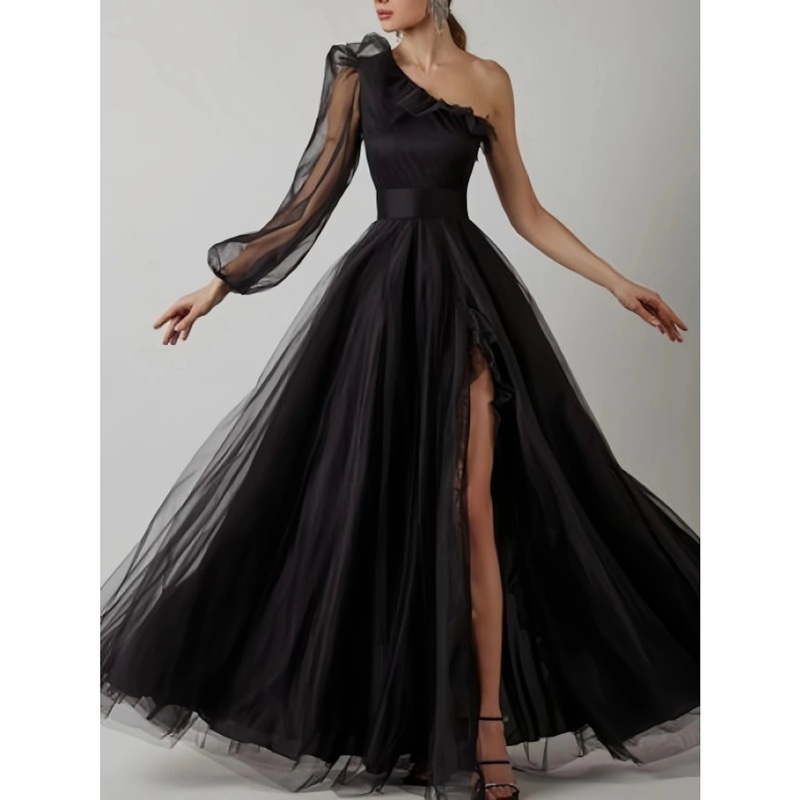 Sheath Party Dress Prom Dresses Elegant Dress Prom Birthday Floor Length Long Sleeve One Shoulder Tulle with Pleats Ruffles Slit