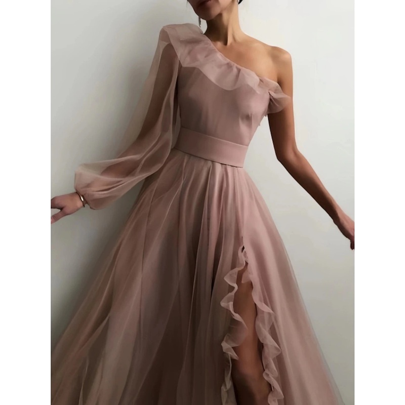 Sheath Prom Dress Elegant Black Dress Plus Size Evening Birthday Floor Length Long Sleeve One Shoulder Tulle with Pleats Ruffles Slit 2025