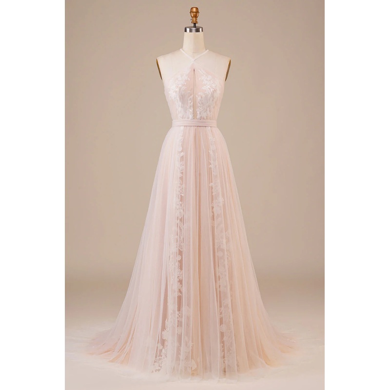 Sheer neckline keyhole champagne sleeveless off shoulder stickers and floor length wedding dress