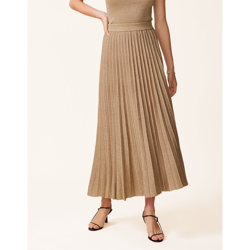 what’s better than a knit skirt? a pleated knit skirt with a shimmering finish. make it a set with the matching knit top.