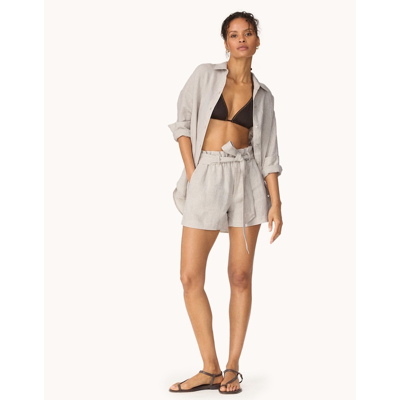your warm weather go-to. these shorts are designed from shimmering, italian linen with a paperbag waist for a touch of volume.
