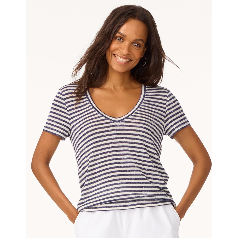 an everyday essential that’s as comfortable as it looks. crafted from soft, breathable linen, we designed this tee with a wide v-neck and shimmer stripes.