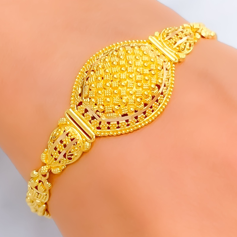 Exuding elegance, this 22k gold bracelet radiates a mesmerizing shimmer with its refined yellow gold finish. Weighing 7.2 grams, its polished design captures the essence of luxury, making it a standout addition to any jewelry collection. Measuring 7.6 inches in length, it includes 0.7-inch adjustable links for a tailored and comfortable fit. The secure hook lock ensures effortless wear while maintaining its graceful appeal. Designed for those who appreciate sophistication with a luminous touch, this bracelet seamlessly blends timeless beauty with contemporary luxury.