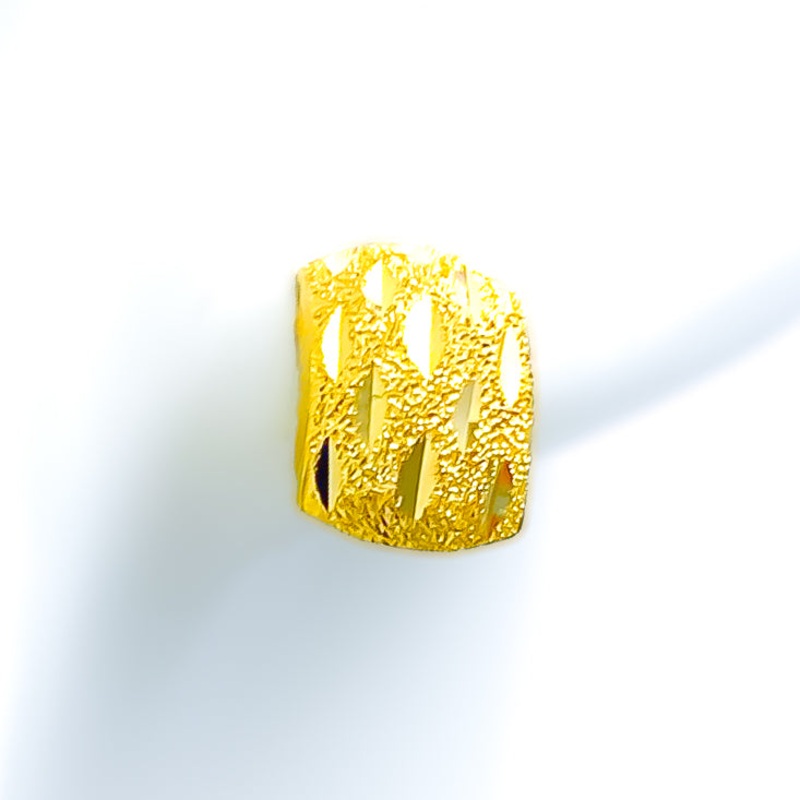 These 22k gold earrings, weighing 2.5 grams, feature a shimmering and trendy design that exudes elegance and sophistication. The yellow gold finish enhances their luxurious and radiant appearance. Measuring 0.5 inches in length, these tops-style earrings are perfect for adding a touch of refined beauty to any outfit. They are secured with push back posts, ensuring a comfortable and secure fit. Ideal for those who appreciate contemporary style and exquisite craftsmanship, these stunning earrings are a standout addition to any jewelry collection.
