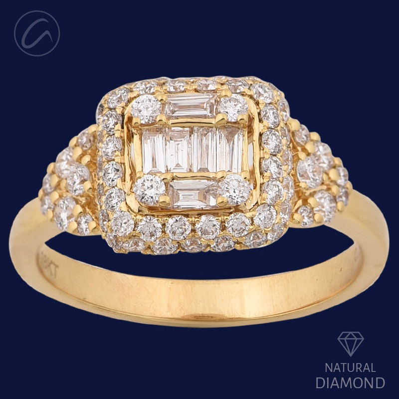 This stylish ring is crafted in 18k yellow gold and weighs 3.7 grams, showcasing a shiny, attractive geometric design. It features an elegant arrangement of round and baguette diamonds totaling 0.80 carats. These diamonds, graded G-H in color and VS in quality, offer brilliant sparkle and clarity. Available in ring size 6 with sizing options available, this piece is perfect for those seeking a sophisticated blend of modern style and timeless elegance. It comes with a GGL certificate, ensuring the authenticity and quality of the diamonds and gold used. This ring is an excellent choice for anyone looking to make a statement with their jewelry.