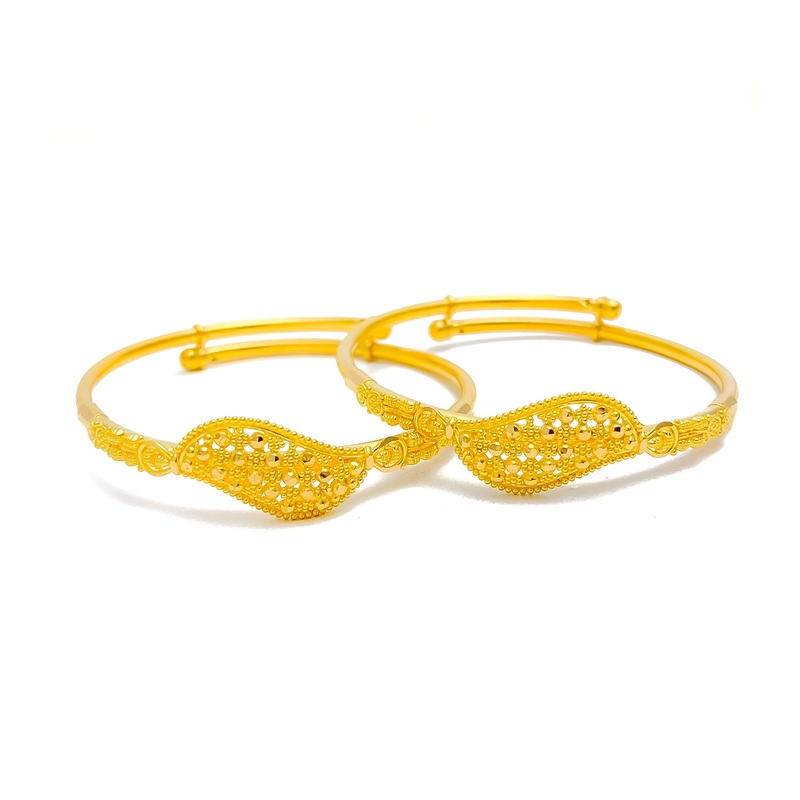 This shiny netted leaf adjustable baby bangle pair, crafted from 22k gold and weighing 11.2 grams, radiates with a luminous yellow gold finish. The bangles have a diameter of 1.75 inches, suited for tender wrists, featuring delicate netted leaf designs tha