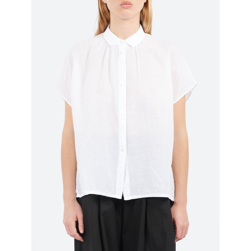 The lightweight and extremely comfortable texture of the cotton linen gauze enhances the everyday look of the shirt, making it versatile.Small collarGathers at the necklineFront button closureShort sleevesStraight cutMaterialsFabric Content: 64% cotton, 36