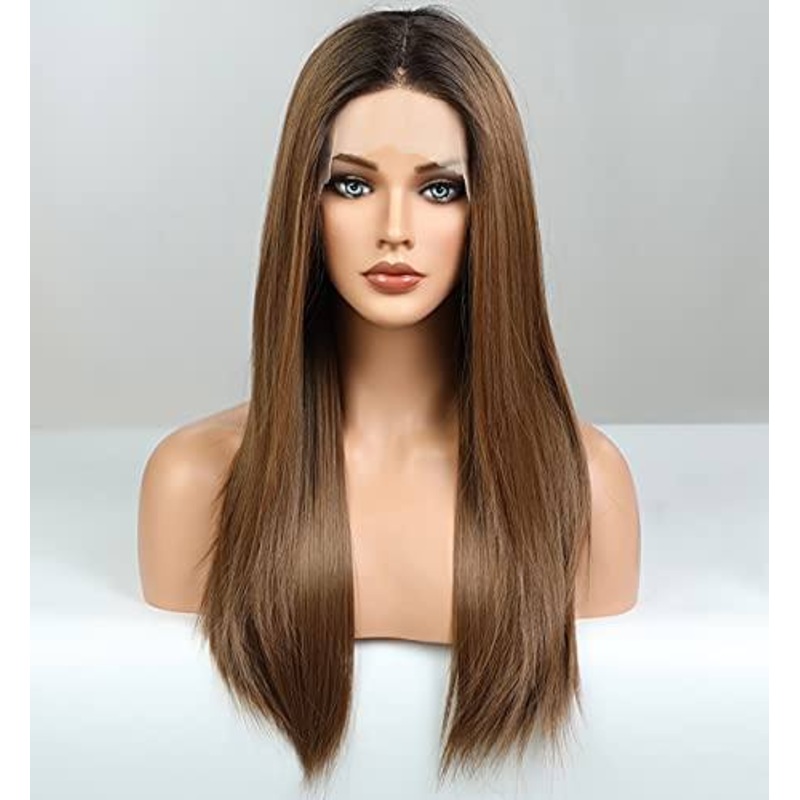 Silky Straight Ombre and Platinum Wig with Heat Friendly FibreT Part Lace Lace Front wigTop Quality Ombre Brown Platinum Blonde Long Straight Lace Front Wigs Natural HairlineHeat Resistant Fiber Hair up to 160 Degrees Centigrade (320 Degrees Fahrenheit)Med