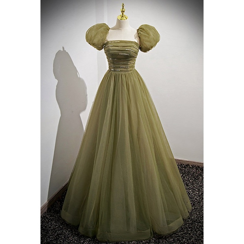 Simple and minimalist clover green square neckline fluffy short sleeved sequin ball dress in clover A-line princess backless and ground length evening dress