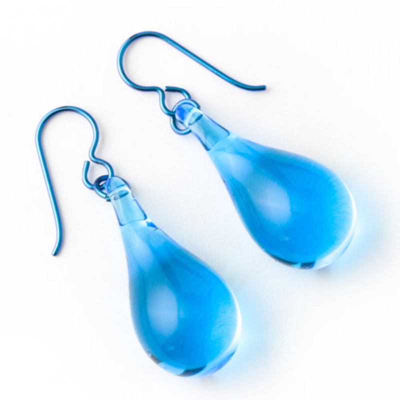 These 20 gauge simple earrings are made from handblown soda lime glass by Gorilla Glass. The hypoallergenic hooks are made from anodized niobium. Choose your color below.