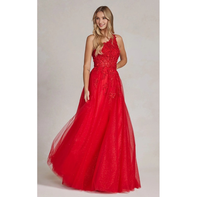 Single shoulder collar lace applique tight corset sheer and floor length Prom dress