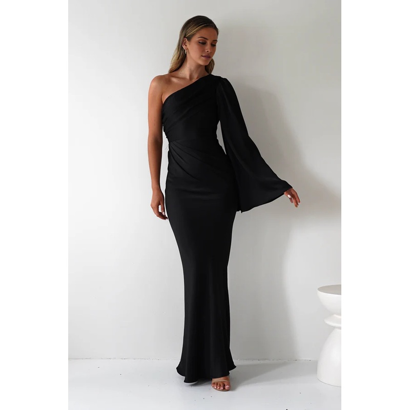 Single sleeve off shoulder satin and floor length Prom Dress – Jimiss Dress