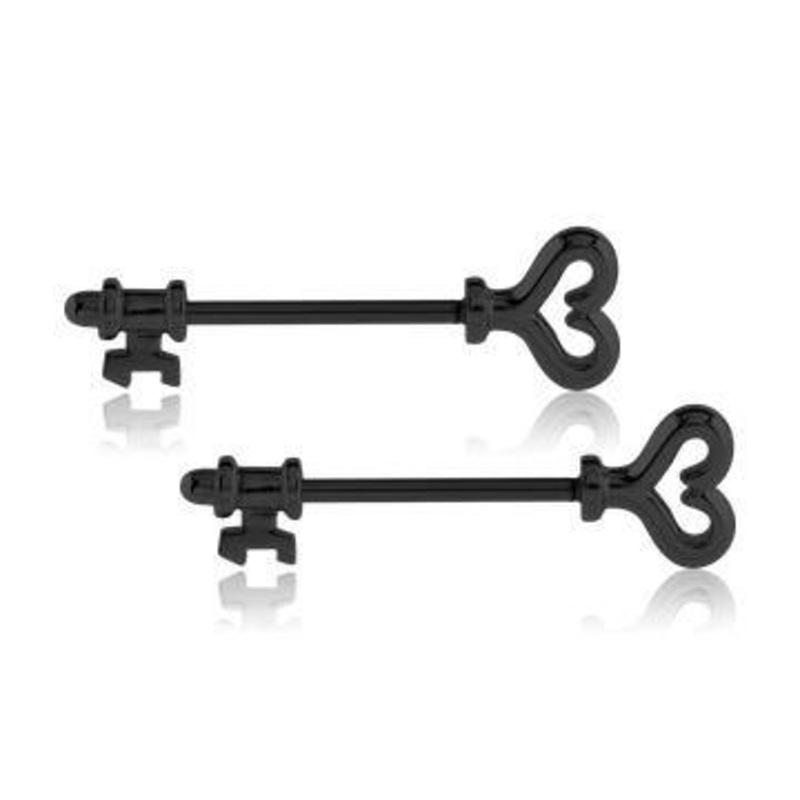 These 14 gauge skeleton key nipple barbells are made from black PVD coated 316L stainless steel with external threading. Choose your size below.