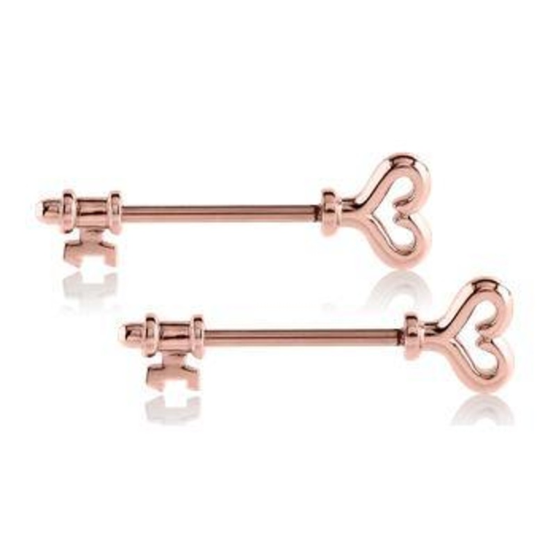 These 14 gauge skeleton key nipple barbells are made from rose gold PVD coated 316L stainless steel with external threading. Choose your size below.