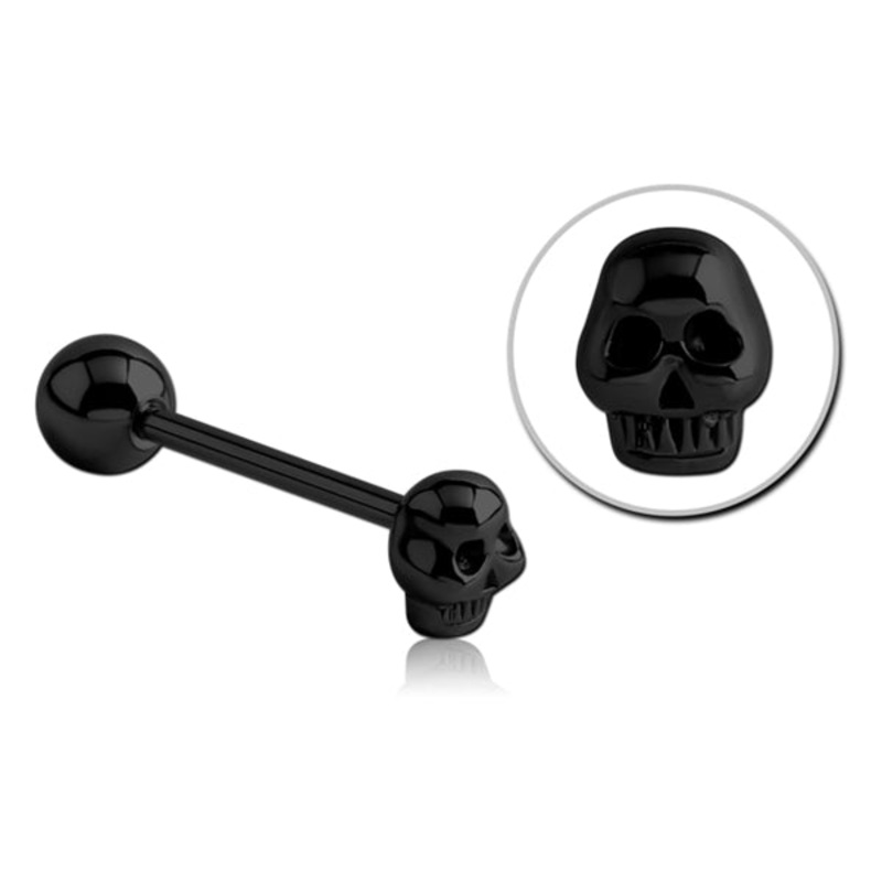 The 14 gauge skull tongue ring is made from black PVD coated 316L stainless steel with external threading. The straight barbell is 5/8" long.