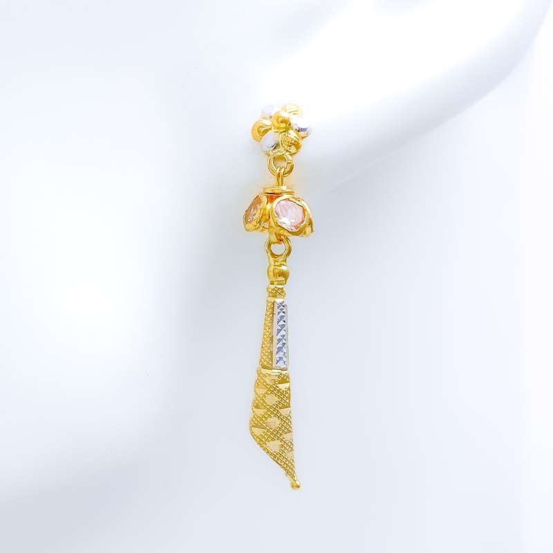 Sleek Asymmetrical CZ Earrings, weighing 4.3 grams of 22k gold for an exquisite touch. The captivating yellow and white gold finish adds a modern allure. Adorned with sparkling cubic zirconia stones, these 1.6" hanging earrings embody high-fashion elegance