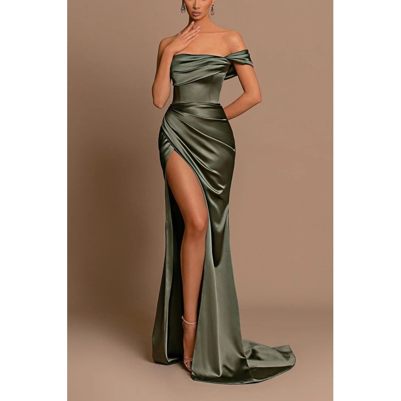 Slim fit/column off shoulder and floor length slit formal prom dress