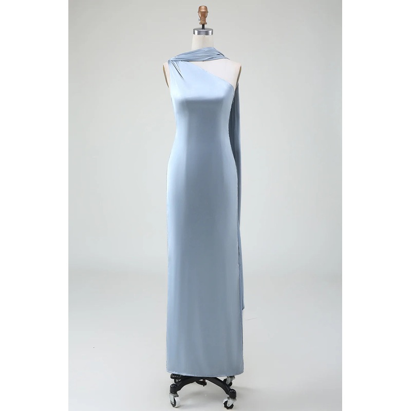 Slim fit one shoulder long satin grey blue bridesmaid dress