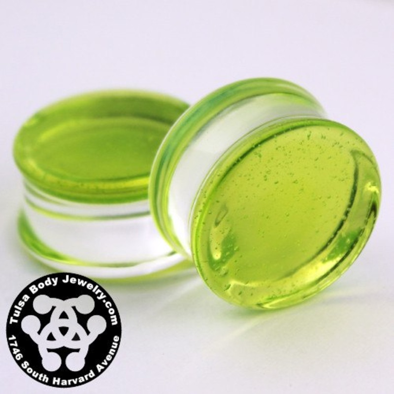 These double flare slimecolor front plugs aremade from hand blown borosilicate glass by Glasswear Studios. They have a wearable area of approximately 3/8" between flares. Choose your size below.