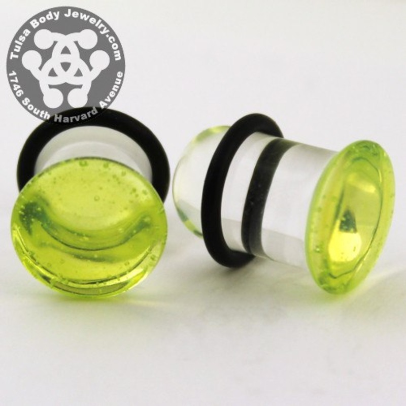These single flare slimecolor front plugs aremade from hand blown borosilicate glass by Glasswear Studios.They have approximately 3/8" wearable area between the flare and o-ring. Two o-rings are included. Choose your size below.