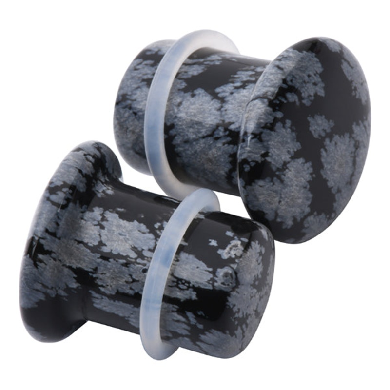 These single flare stone plugs are made from Snowflake Obsidian. Two clear silicone o-rings are included. They have a wearable area of 3/8" between the o-ring and flare.[click here for replacement o-rings]