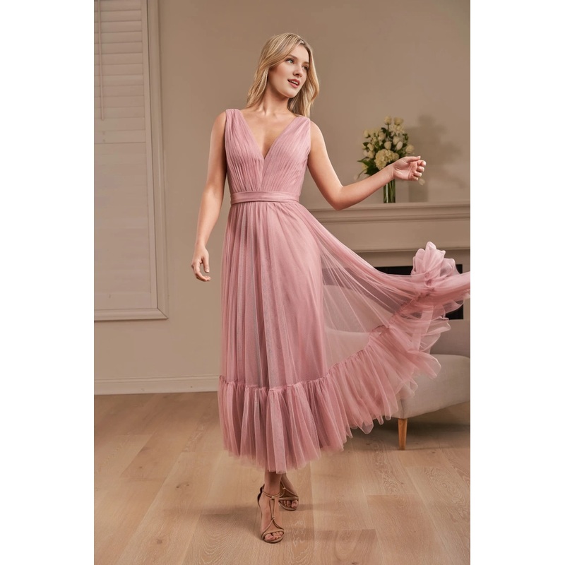 Soft chiffon A-line pleated V-neck ruffled mid length bridesmaid dress