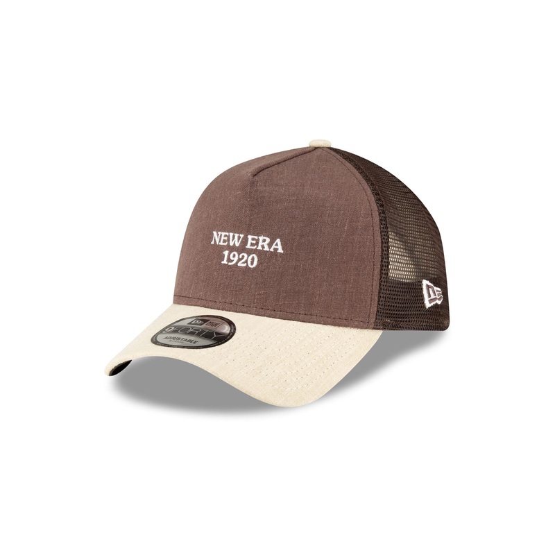 The Soft Linen Brown 9FORTY A-Frame Trucker features an embroidered New Era wordmark at the front panels with a stone visor, black undervisor, and a snapback closure at the rear.