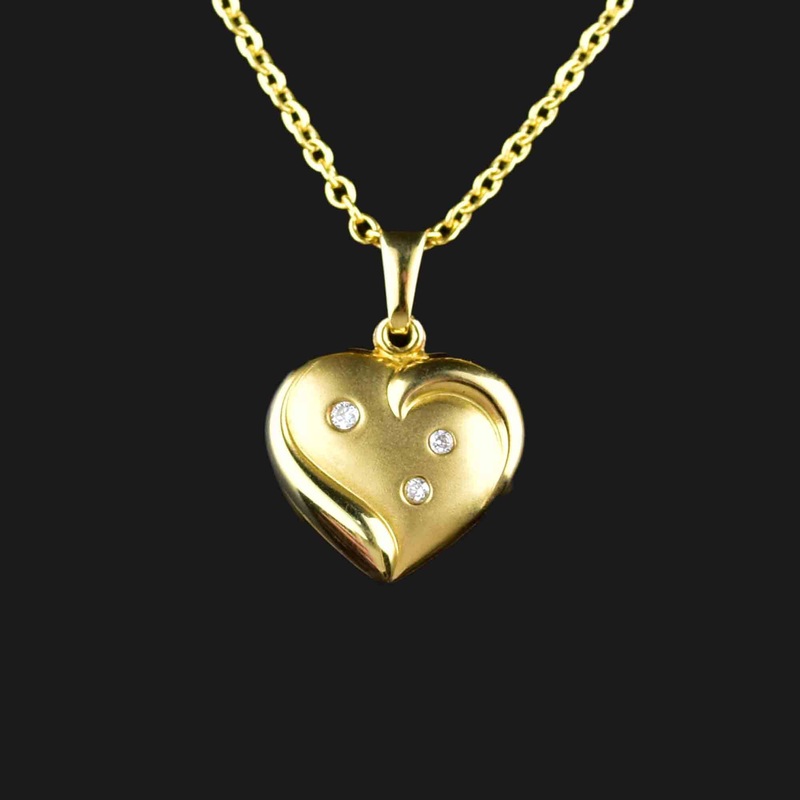 This 14K gold pendant features sparkling round diamonds in a puffy heart shape that sways with a sweet charm. The vintage-inspired design adds a touch of uniqueness to this classic piece of jewelry. Give it as a gift to show your love for that special someone!
