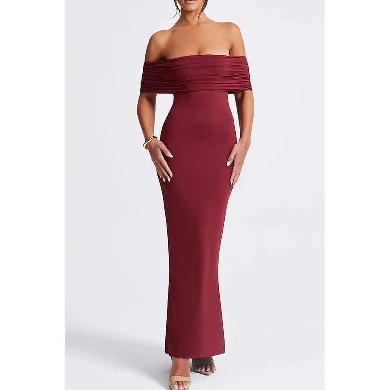 Solid color hollow patchwork backless pleated shoulder long evening dress