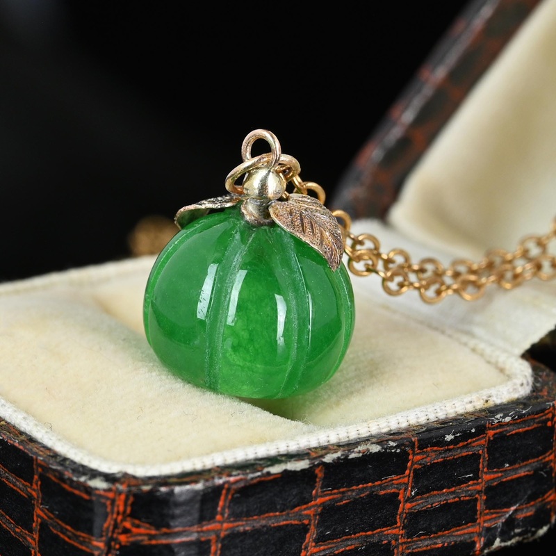 Adorable carved jade pumpkin charm pendant! This gorgeous jade pumpkin features intricate 9k gold leaves surrounding the top with the natural jade displaying a vibrant shade of green. Jade has been used for centuries to attract love, making this an extra special and stunning piece of vintage jewelry.
