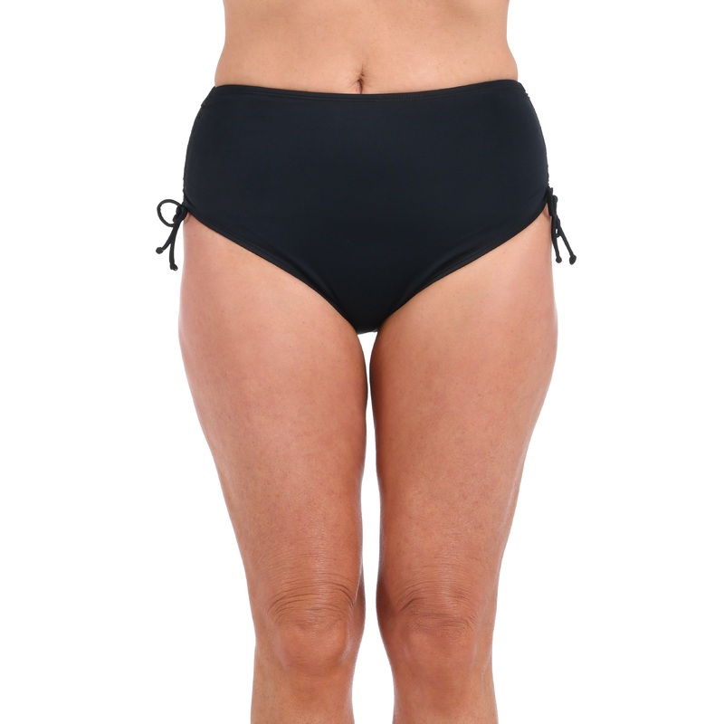 We love the classic look of solid color swim bottoms. They highlight and define your silhouette in all the right ways. Adjustable side tie loops reveal just a hint of skin while flattering the hips. Ample rear coverage allows you to move around freely and comfortably, without having to worry about exposing more than you want. This bottom also features flattering tummy toner to discreetly conceal unwanted excess. Bottom sold separately.