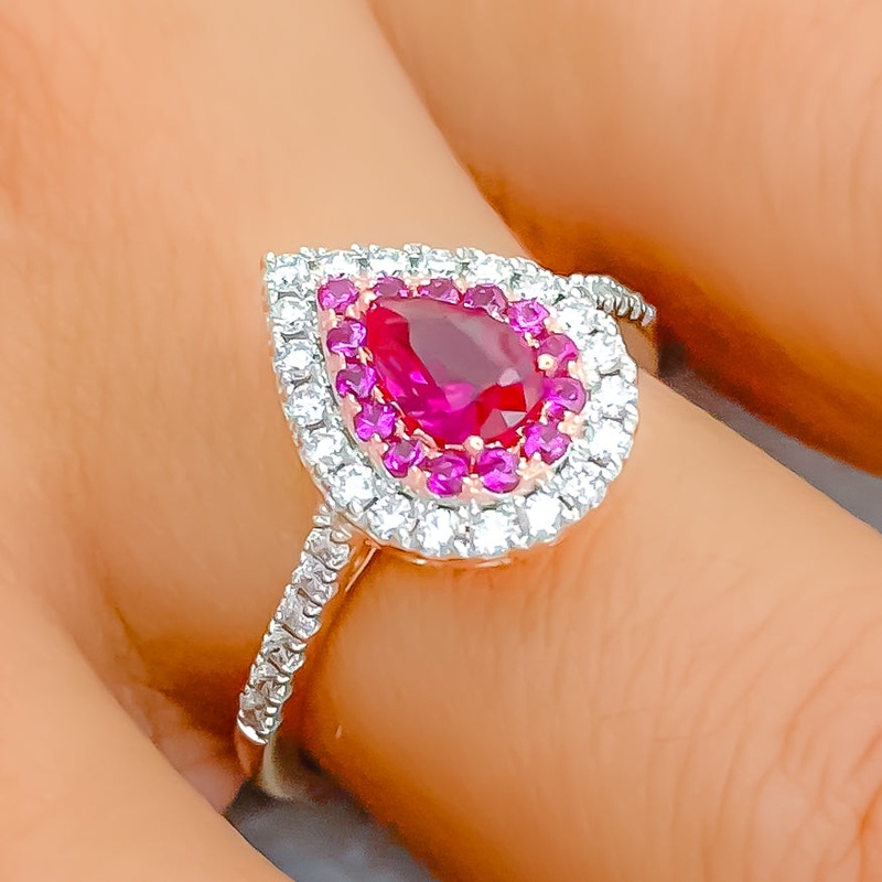 Indulge in sophistication with our Sophisticated Lush 18K Rose Gold + Diamond Ring. Meticulously crafted from opulent 18k rose gold, weighing 3.5 grams, this exquisite piece showcases a captivating round brilliant-cut diamond weighing 0.35ct. Radiating in F-G color and VS quality, it emanates timeless allure. Embellished with a pear drop-shaped cultured ruby, this ring exudes luxury. Available in size 6.25, with ring sizing options for a perfect fit.
