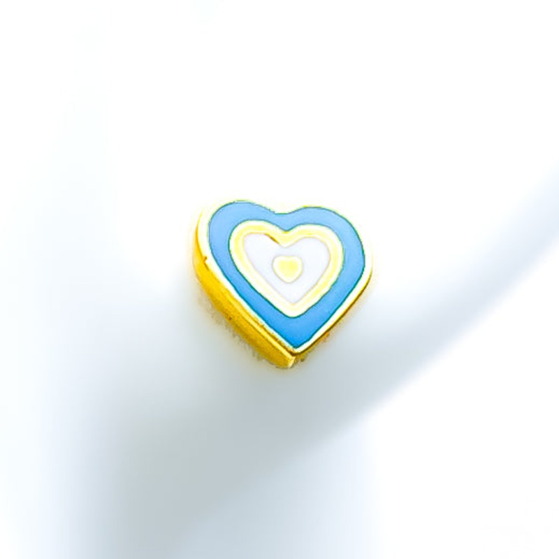 Charming and elegant, these 21k gold earrings feature a delicate heart design accented with vibrant turquoise enamel. Weighing 1.5 grams, the radiant yellow gold finish enhances their refined appeal, creating a perfect balance of sophistication and playfulness. Designed in a classic tops style, these earrings have a compact 0.25-inch diameter, making them ideal for effortless everyday wear. Secured with a push-back post, they offer both comfort and convenience. Perfect for those who appreciate fine craftsmanship with a pop of color, these earrings are a stylish addition to any jewelry collection.