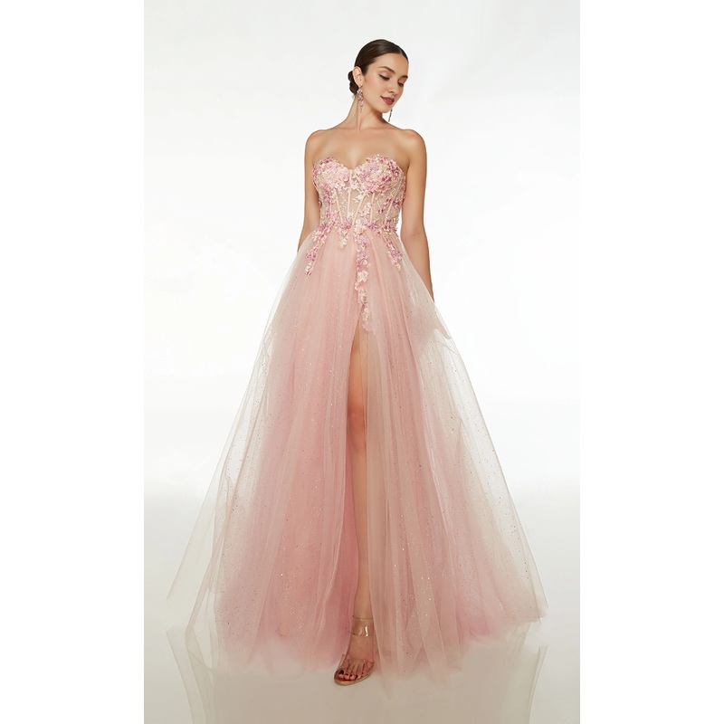 Sparkling chiffon strapless A-line evening gown tight corset floral lace applique long formal dress