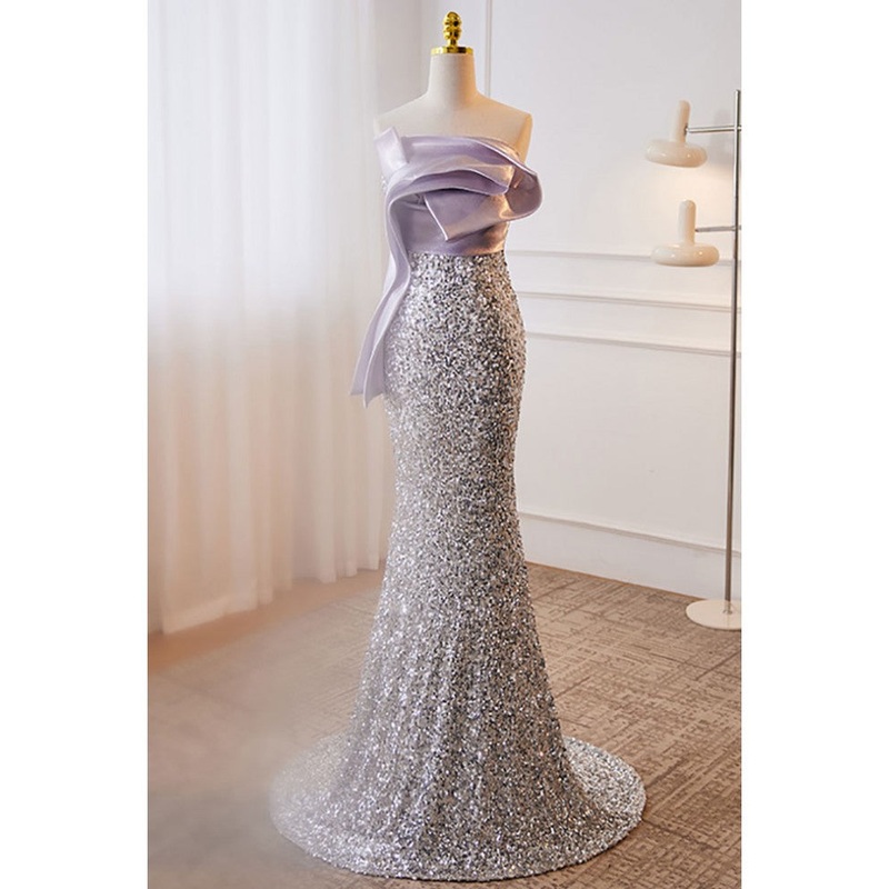 Sparkling lavender color sleeveless off shoulder sequin evening dress with lavender color mermaid backless strap and floor length evening dress
